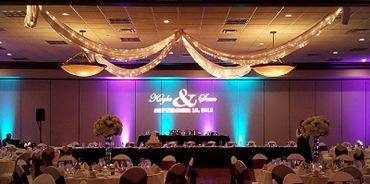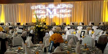 We offer a wide variety of uplighting ideas and custom monograms, plus wall/ceiling/floor textures & designs, spot lighting, wash lighting, and more! Plus we are able to provide full event production including staging, pipe & drape, video, and anything else your event may need to be a success.